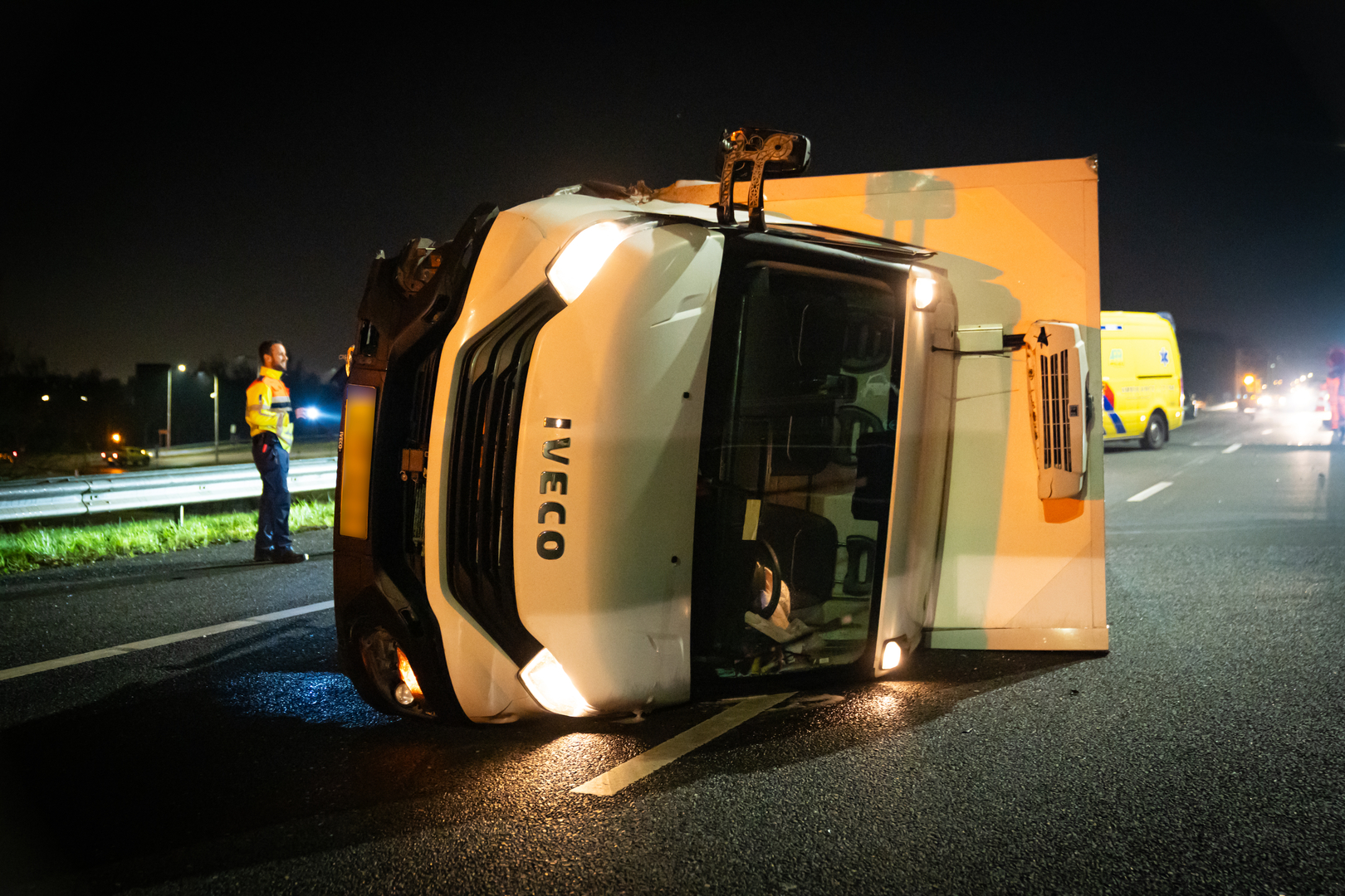 Op de A29 bij Barendrecht is een bakwagen in de nacht van vrijdag op zaterdag op z'n kant terecht gekomen. Hoe dat precies kon gebeuren is niet duidelijk, er waren geen andere voertuigen bij het ongeluk betrokken.