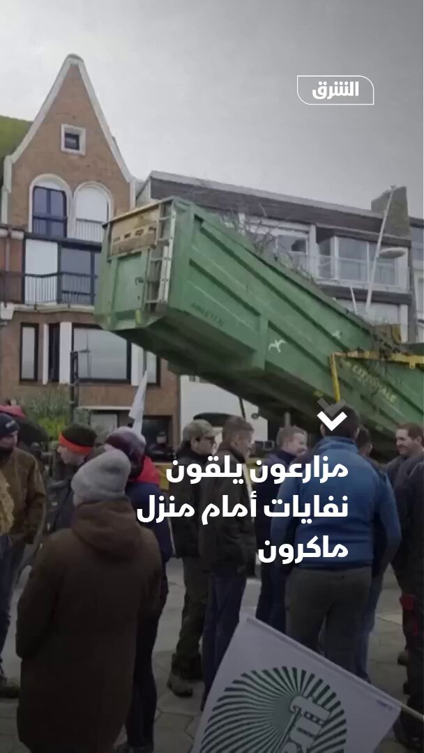 عشرات المزارعين الفرنسيين يلقون القمامة ونفايات زراعية أمام منزل مملوك للرئيس إيمانويل ماكرون في بلدة لو توكيه، شمال البلاد.