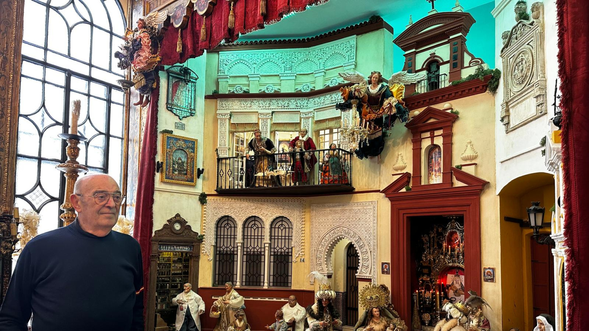 En una casa del centro de Sevilla, el belén no es solo una tradición navideña, sino una forma de contar la historia de un barrio y de una familia. La vivienda de Rogelio llama la atención ya desde fuera. Su fachada, singular y reconocible, invita a detenerse. Pero al entrar se descubre que aquí no hay un solo belén. “Montamos más de uno”, explica. Y cada uno tiene su función y su momento. Nada más cruzar la entrada, a la izquierda, se encuentra un pequeño oratorio. Allí está el belén fijo, el que permanece durante todo el año y el que muchos vecinos y visitantes observan desde la calle a través de un cristal. Es el corazón del conjunto. Este belén del oratorio está inspirado en el barrio del Arenal. A la izquierda ponemos ver una escena que tal y como describe Rogelio “Es un homenaje a mi padre, que vino a trabajar a la tienda del Reloj en 1929 con doce años”. A partir de ahí, el Nacimiento se convierte en un recorrido por calles, fachadas y escenas reconocibles del entorno, donde el misterio convive con referencias muy personales. No es un belén genérico. Cada detalle tiene sentido y responde a una historia concreta: la familia, los vecinos, las devociones del barrio. Por eso Rogelio lo resume con una frase que da título al reportaje: “No es Judea, es mi barrio”. En el vídeo, Rogelio recorre el belén fijo del oratorio y va señalando algunos de sus detalles más significativos. Explica cómo el Nacimiento recoge la historia de su familia y del barrio del Arenal, desde la llegada de su padre a Sevilla hasta los guiños a vecinos, tradiciones y devociones. Durante el recorrido aparecen escenas muy reconocibles: la fachada de su casa con la familia asomada al balcón, referencias a la Hermandad del Baratillo, Santa Ángela de la Cruz o el Arco del Postigo. También detalles curiosos, como un sistema de luces que marca el paso del día a la noche o la reproducción exacta de un desconchón en el rótulo de una calle del barrio. Además del belén fijo, cada año la familia monta otro en la entrada de la casa, pensado especialmente para las fiestas. Es un belén cambiante, que en otras ocasiones ha llegado a tener figuras a tamaño real. Este año, el protagonismo lo tiene la Divina Pastora de Cantillana, de tamaño natural, que sostiene al Niño en brazos. Una figura cedida por una familia cercana y que se ha convertido en uno de los grandes reclamos de esta Navidad. Durante todas las navidades, muchos se detienen frente a esta casa al pasar por la calle Tomás de Ibarra. El belén del oratorio se ve perfectamente desde la calle y el montaje navideño completa una estampa que sorprende a quien no la espera. Sin grandes anuncios ni horarios, este belén se ha integrado en el recorrido navideño del centro de Sevilla como una parada tranquila y diferente. Una forma de vivir la Navidad desde lo cercano, lo personal y lo compartido.