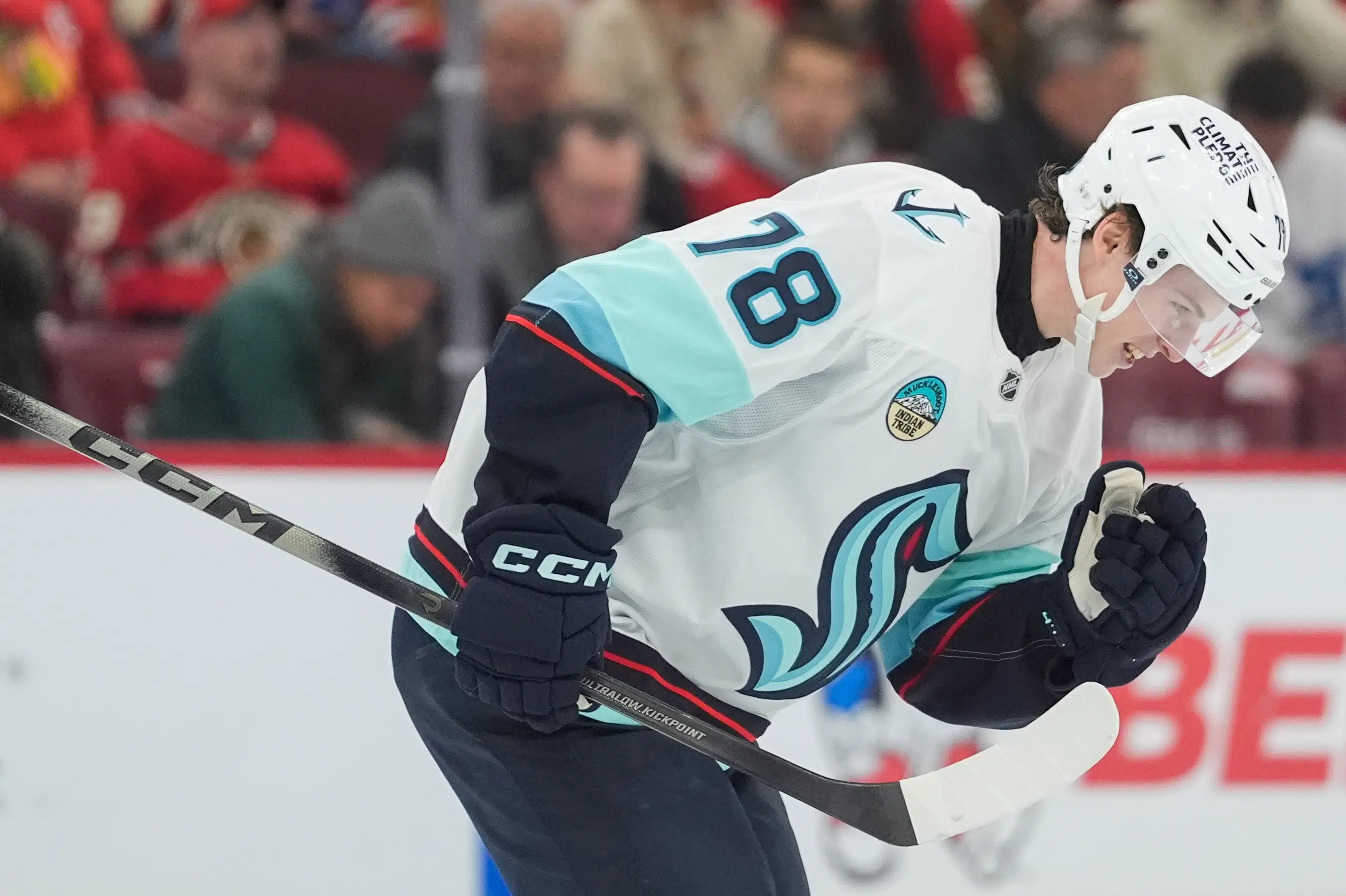 Tusindvis af tøjdyr væltede ned over banen efter Oscar Fisker Mølgaards mål for Coachella Valley Firebirds.