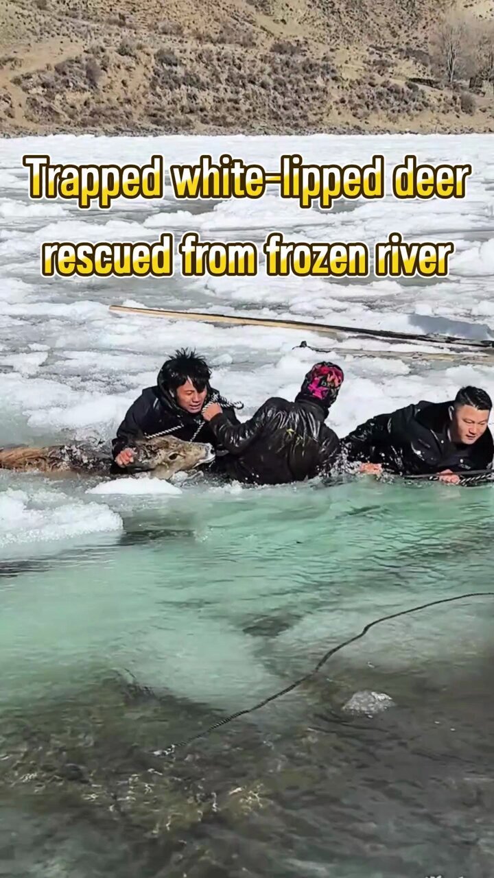 Three white-lipped deer trapped in a frozen river were rescued by police and villagers in Dege County, China's Sichuan. The species is under China's highest national-level protection. #China #WhiteLippedDeer #Rescue #Wildlife