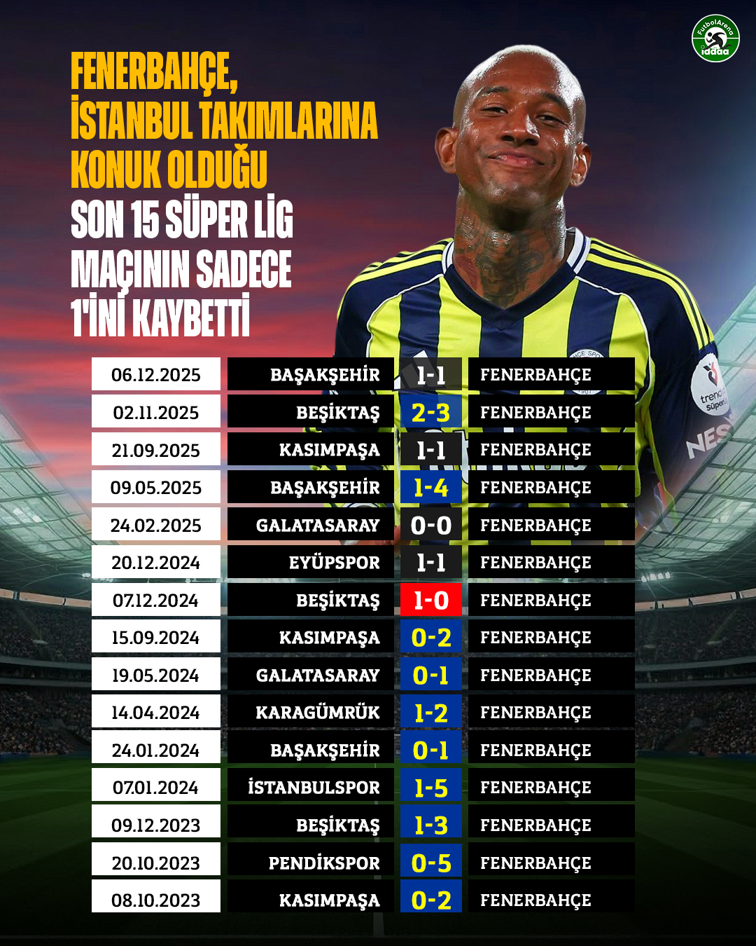 RT @iddaafa: ✍️ Fenerbahçe, İstanbul takımlarına konuk olduğu son 15 Süper Lig maçının sadece 1'ini kaybetti.