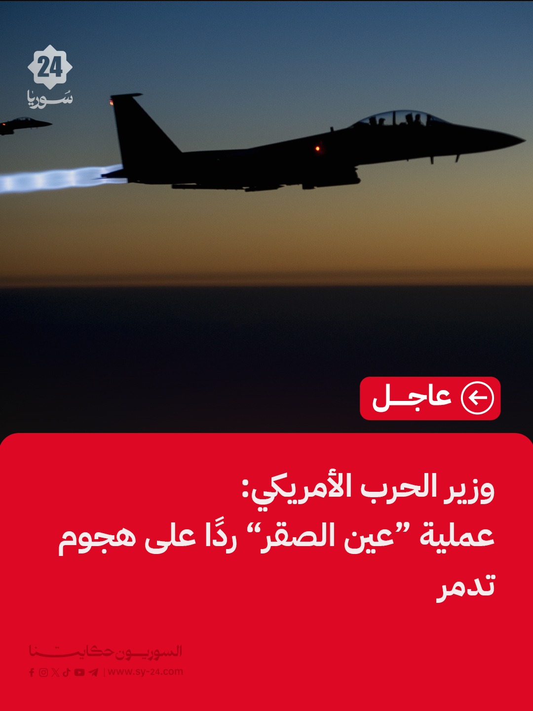 وزير الحرب الأمريكي: عملية “عين الصقر” ضد مواقع داعش في سوريا عملية ثأر وليست حربًا. قواتنا بدأت عملية في سوريا للقضاء على مقاتلي التنظيم وبنيته التحتية ومواقع أسلحته طاردنا أعداءنا اليوم في سوريا وقتلنا الكثير منهم وسنواصل ذلك The post وزير الحرب الأمريكي: عملية “عين الصقر” appeared first on SY24 .