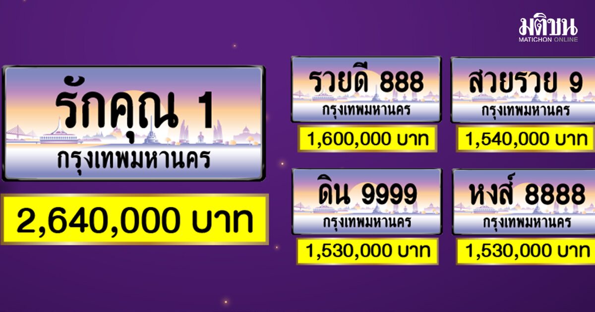 ขนส่ง ประมูลทะเบียนรถเลขสวย โกยรายได้กว่า 42 ล้าน ‘รักคุณ 1’ ฮอตเสนอ 90 ครั้ง ราคาพุ่ง 2.64 ล้าน