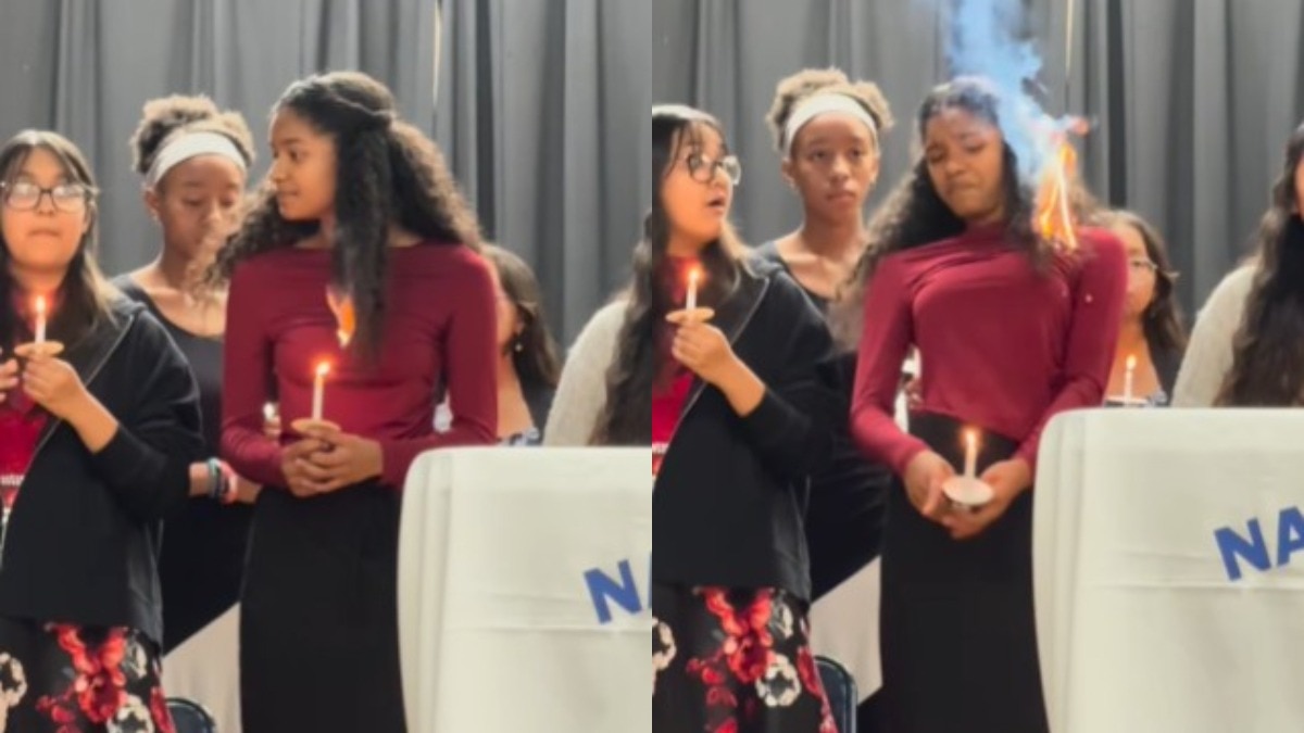 सोशल मीडिया पर एक वीडियो वायरल हो रहा है छात्रा हाथ में मोमबत्ती पकड़े मंच पर खड़ी थी. इसी दौरान अचानक मोमबत्ती की लौ उसके बालों तक पहुंच गई और कुछ सेकंड के लिए आग लग गई.लेकिन इसके बाद जो उसने खुद को संभाला ये मोमेंट वायरल है.आइए जानते हैं इस वायरल वीडियो के पीछे की पूरी कहानी.