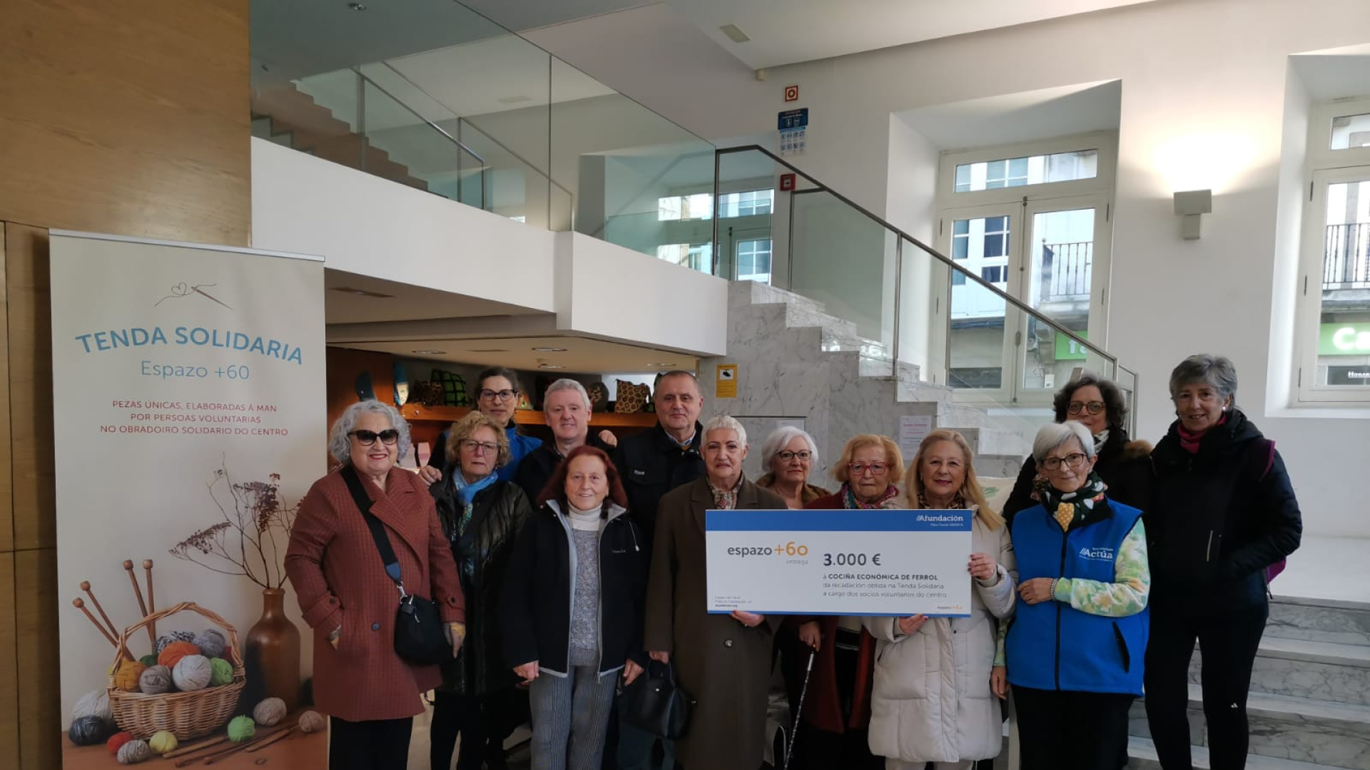 Las personas voluntarias del Espazo +60 de Afundación en Ferrol han entregado esta mañana un cheque solidario de 3.000 euros a la Cocina Económica de la localidad. Esta cifra es la recaudación obtenida en su tienda solidaria, donde se venden productos de artesanía elaborados por las socias que participan desinteresadamente en el taller solidario del centro durante todo el año. En el acto de entrega han estado presentes la coordinadora del Espazo +60, Mercedes Garnelo; el tesorero de la Cocina Económica, Julián López; y las propias socias voluntarias. Se trata de una colaboración que se mantiene activa desde el año 2006 y que ya ha conseguido donar más de 60.000 euros en total a la entidad benéfica. El germen de este proyecto, bautizado como «Mayores solidarios», surgió en 2005. Fue en el taller de manualidades del centro, cuando la profesora propuso a las alumnas confeccionar vendas para los pacientes con lepra del Sanatorio de la Fundación Fontilles de Alicante, que sufrían escasez de material. La idea fue acogida con entusiasmo y sentó las bases para futuras colaboraciones. Actualmente, el taller solidario está formado por 23 personas con edades comprendidas entre los 65 y los 97 años, coordinadas por Ana Vila. Ellas son las encargadas de elaborar una gran variedad de productos artesanales, como mandiles, complementos de lana, trabajos de patchwork, marcapáginas, bolsos o llaveros. Entre sus creaciones más originales se encuentran las bolsas de compra hechas con paraguas reciclados, un ejemplo del espíritu de la actividad. El taller no solo busca recaudar fondos, sino también promover el desarrollo de hábitos de reciclado, la creatividad y la imaginación, al tiempo que fomenta la solidaridad y la cooperación entre sus participantes. Esta acción se enmarca dentro del programa «El valor de la experiencia» del Área de Mayores de Afundación. La finalidad de este programa es potenciar el papel activo de los mayores en la sociedad a través del voluntariado y otras actividades que aporten valor a la comunidad.