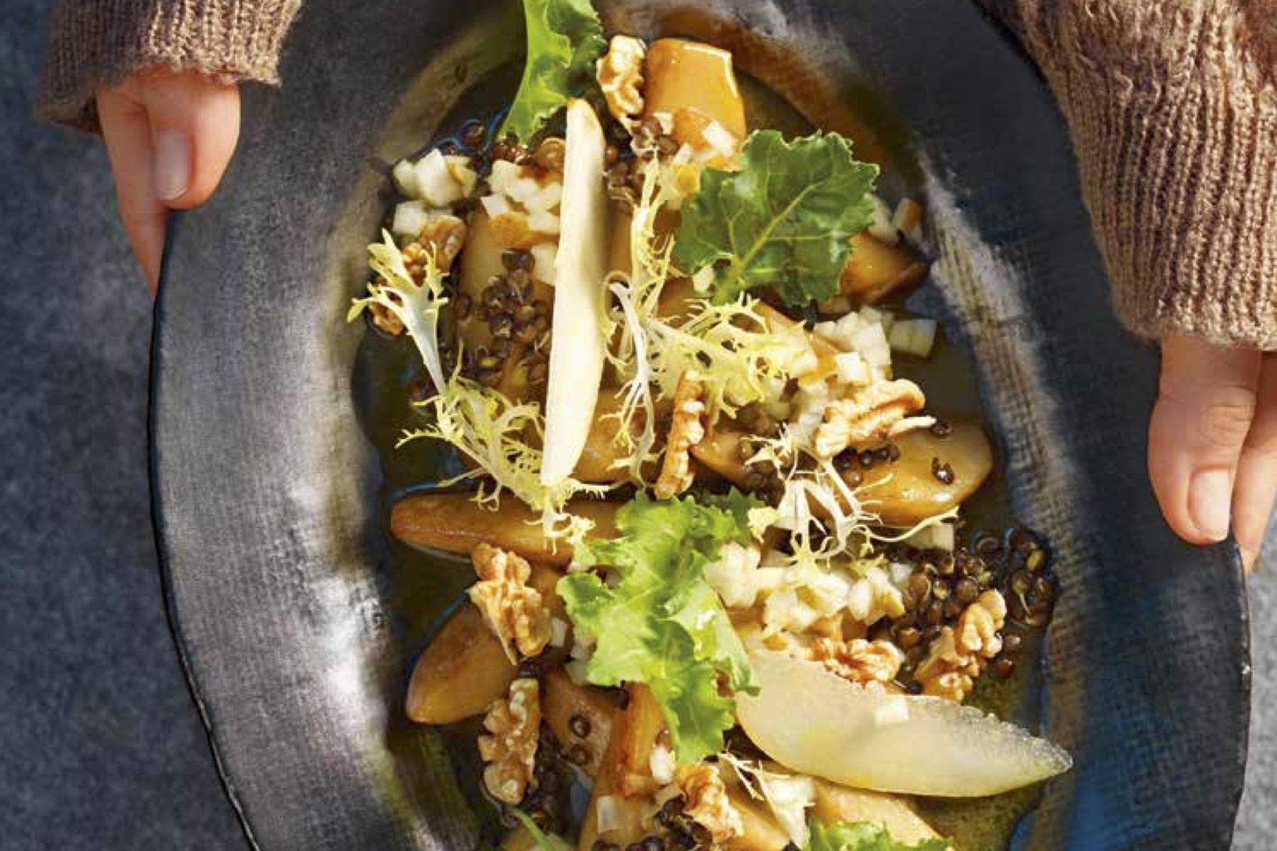 In diesem Gericht von Paul Ivić trifft knackiger Topinambur auf fruchtige Birnen und fein-würzige Linsensprossen.