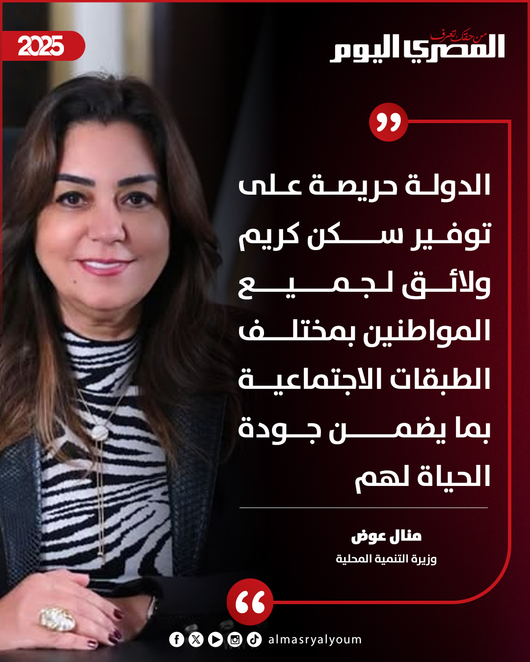 ⭕ وزيرة التنمية المحلية: الدولة حريصة على توفير سكن كريم ولائق لجميع المواطنين بمختلف الطبقات الاجتماعية بما يضمن جودة الحياة لهم
