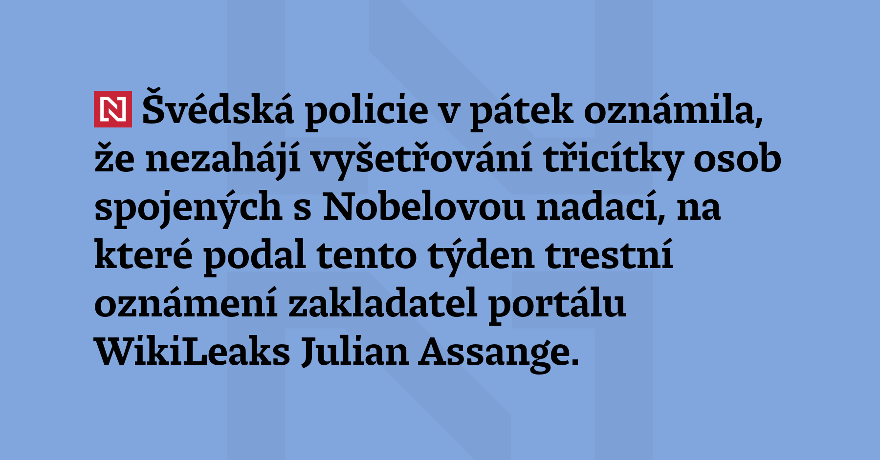 Švédská policie v pátek oznámila, že nezahájí vyšetřování třicítky osob spojených s Nobelovou nadací, na které podal tento týden trestní oznámení zakladatel portálu WikiLeaks Julian Assange. Podle něj se dopustili zpronevěry a napomáhání k válečným zločinům, když udělili Nobelovu cenu za mír lídryni venezuelské opozice Machado, informovala agentura AFP. (ČTK) JULIAN ASSANGE FILES CRIMINAL COMPLAINT AGAINST NOBEL FOUNDATION OVER […]