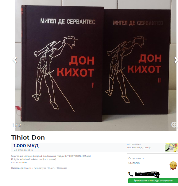Оглас на еден од макеодонските портали. За малку, и ќе го погоделе вистинскиот наслов. Сервантес или Шолохов, не е битно. Тихиот Дон или Дон Кихот, има ДОН во себе. Разликата е само во временскиот период и неколку стотици страници на страна на Тихиот. За малку, би рекле...