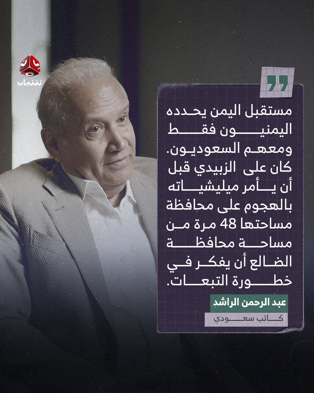 كتب الإعلامي السعودي عبد الرحمن الراشد مقالًا في صحيفة الشرق الأوسط بعنوان «الانتقالي فتح عشّ الانفصاليين»، أكد فيه أن مستقبل اليمن يقرره اليمنيون وحدهم وبمساندة السعودية.