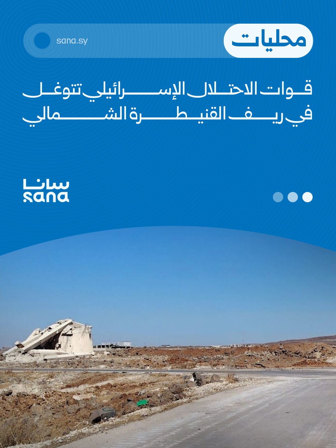 مراسل سانا في القنيطرة: دورية تابعة للاحتلال الإسرائيلي مؤلفة من خمس آليات عسكرية، توغلت انطلاقاً من نقطة العدنانية باتجاه قرية أم العظام، سالكة الطريق المحاذي لسد المنطرة، وصولاً إلى قرية السعايدة في ريف القنيطرة الشمالي.