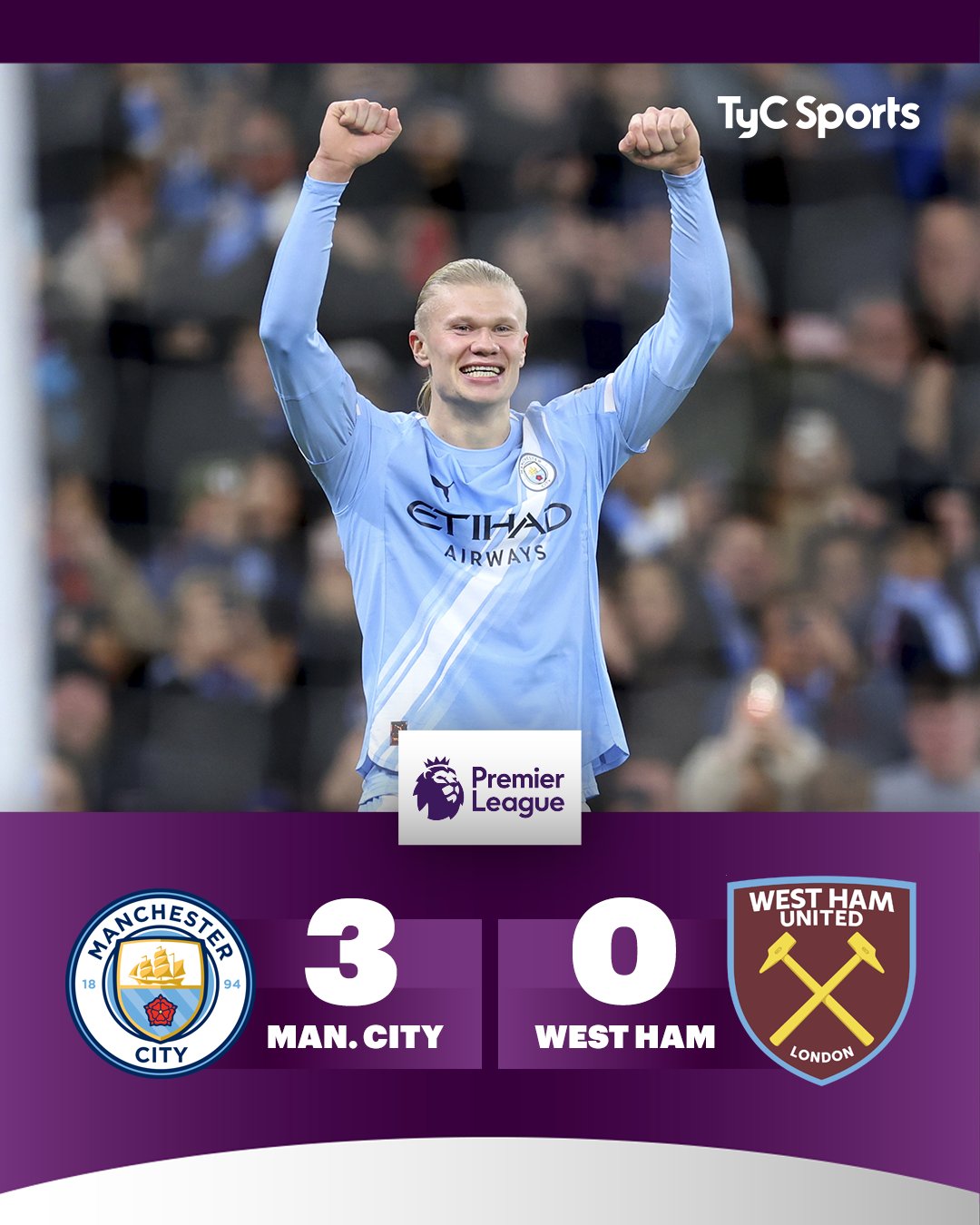 Los Ciudadanos vencieron por 3-0 al West Ham y treparon momentáneamente a la cima de la tabla de posiciones de la #PremierLeague, un punto por arriba del Arsenal. Doblete del Androide Erling Haaland y un tanto de Reijnders para