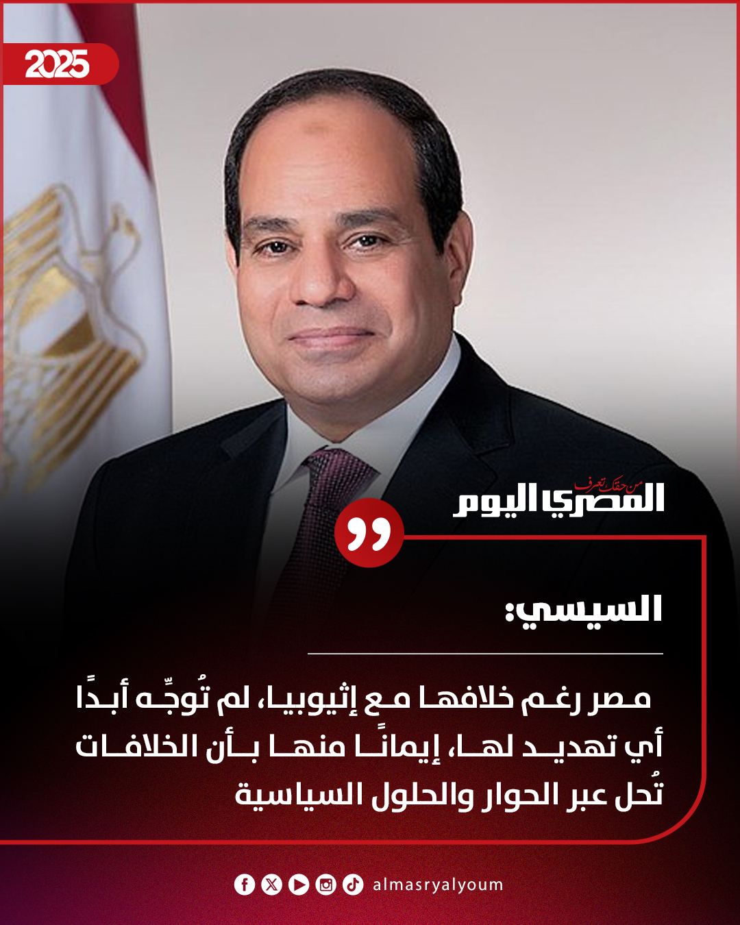 السيسي: مصر رغم خلافها مع إثيوبيا، لم تُوجِّه أبدًا أي تهديد لها، إيمانًا منها بأن الخلافات تُحل عبر الحوار والحلول السياسية