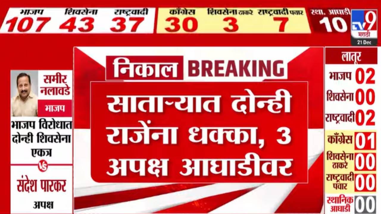 महाराष्ट्र स्थानिक स्वराज्य संस्था निवडणुकीत भाजपने पुन्हा एकदा वर्चस्व मिळवले आहे, सर्वाधिक जागांवर आघाडी घेत भाजप सर्वात मोठा पक्ष ठरला आहे. नागपूरसह अनेक ठिकाणी भाजपने चांगली कामगिरी केली आहे. विशेषतः साताऱ्यात उदयनराजे आणि शिवेंद्रराजे या दोन्ही राजांना धक्का बसला असून, तीन अपक्ष उमेदवार आघाडीवर आहेत.
