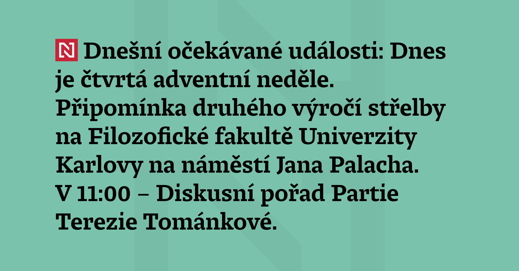Dnešní očekávané události: Dnes je čtvrtá adventní neděle. Připomínka druhého výročí střelby na Filozofické fakultě Univerzity Karlovy na náměstí Jana Palacha. V 11:00 – Diskusní pořad Partie Terezie Tománkové. Hosté: Jaroslava Pokorná Jermanová (ANO), Radim Fiala (SPD), Jan Lipavský (nestr. za ODS), Jan Farský (STAN); v druhé části Jindřich Šídlo, Dalibor Balšínek, Milan Bednář, Pavel Peterka. Francouzský prezident […]