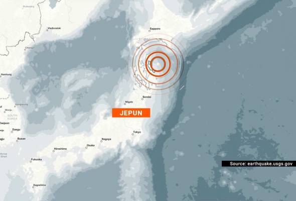 Pusat gempa dikenal pasti pada latitud 40.7 darjah utara dan longitud 142.3 darjah timur.