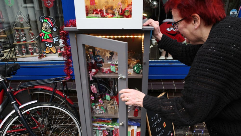 De mooiste kerstversiering van de omgeving werd vernield, toch is het vertrouwen in de mensheid nog volop aanwezig in de Haarlemse Transvaalbuurt. Elly Opdam heeft deze week een speciale kerstruilkast voor haar rijtjeswoning in de Javastraat gezet. "Zo hebben anderen er ook wat aan." Ja, natuurlijk had Elly Opdam gehoord over de vernieling enkele straten verderop . Het incident, waarbij de uitbundige kerstversiering voor het huis van Els werd vernield, ging als een lopend vuurtje door de buurt. Iedereen sprak er schande van, maar het weerhield Elly er niet van om om iets nieuws te bedenken: een kerstruilkast. De kast, pal naast haar voordeur, zit helemaal vol met snuisterijen voor de feestdagen. Kerstballen, miniaturen van kerstmannen, glitters voor op het gezicht. "Eigenlijk kan alles er wel in", zegt Elly, "zolang het maar iets met kerst te maken heeft." Het idee is dat elke voorbijganger er wat uit mag halen en er iets anders kerstigs voor terugzet. Tekst loopt door na de foto. Wie langs de kast kijkt en via het raam een blik in de woonkamer werpt, ziet dat Elly over een grote verzameling kerstprullaria beschikt. "Zo is het begonnen", bekent ze. "Ik had zoveel kerstspulletjes dat ik het in huis niet meer kwijt kon. Ik dacht: alles wat ik niet gebruik, zet ik in een kast voor de deur. Zo hebben anderen er nog wat aan." Zadenbieb Het is een beproefd recept van Elly, die al jaren weggeefkastjes voor haar huis heeft staan. In het voorjaar opent ze de zadenbieb. Zaden van planten of kruiden die zij zelf niet gebruikt, biedt ze aan in het kastje. In aanloop naar Pasen richt ze de kastjes in met speelgoedhaasjes en eierdoppen. De rest van het jaar zijn de planken gereserveerd voor boeken. Tekst loopt door na de foto. Ontstemd Het is allemaal gratis mee te nemen. Elly: "Het is eigenlijk de bedoeling dat je er ook iets in zet als je er iets uit haalt. Maar als dat een keertje niet lukt, dan is dat ook geen ramp." Ontstemd was ze één keer: vorig jaar, toen een voorbijganger de complete inhoud van de kastjes had meegenomen, zonder er iets voor in de plaats te zetten. Met vandalisme heeft ze - in tegenstelling tot haar buurtgenoot Els - nog niet te maken gehad. Speciaal voor de feestdagen heeft Elly haar ruilkasten extra uitgerust. Ter demonstratie opent ze een deurtje: LED-lampjes springen aan. Haar ruilkasten zijn voor de Transvaalbuurt lichtpuntjes in donkere tijden.
