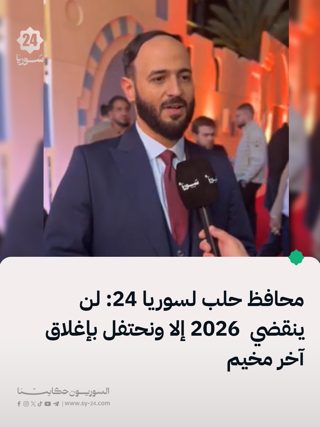 مخيم محافظ حلب عزام الغريب لسوريا 24: تبرعات «حلب ستّ الكل» ما تزال متواصلة، ومن المتوقع الإعلان عن الحصيلة النهائية للمبالغ التي جُمعت خلال الأيام القادمة. اللجنة العليا للحملة عملت على مدى ثلاثة أشهر على إعداد خارطة شاملة لاحتياجات محافظة حلب، مع إعطاء أولوية واضحة للمناطق الأكثر تضرراً. نحو 80 في المئة من المشاريع المدرجة […] The post مخيم محافظ حلب عزام الغريب لسوريا 24: appeared first on SY24 .
