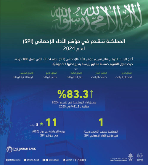 حققت المملكة العربية السعودية ممثلةً في الهيئة العامة للإحصاء منجزًا جديدًا بمواصلة تقدمها في مؤشر الأداء الإحصائي (SPI) الصادر عن البنك الدولي منذ تحديث البيانات عام 2020م، حيث ارتفع تقييمها إلى (83.3 %) في عام 2024م مقارنة بما نُشر في العام الماضي 2023م (81.5 %)، محافظةً