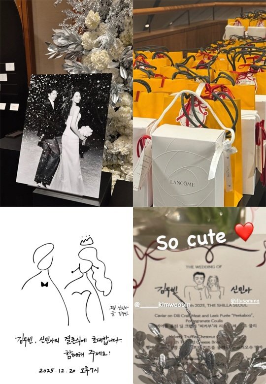 배우 김우빈과 신민아가 20일 결혼식을 올린 가운데, 그들이 하객들에게 건넨 답례품이 화제를 모으고 있다. 22일 연예계에 따르면 결혼식 이후 온라인 커뮤니티와 소셜미디어를 통해 통해 공개된 답례품은 신민아가 앰배서더(홍보대사)로 활동 중인 글로벌 뷰티 브랜드와 럭셔리 향수 브랜드 제품이다.함께 동봉된 카드에는 “김우빈, 신민아의 결혼식에 초대합니다. 함께해 주세요”라고 적혔다.또 이날 결혼식 메뉴판에는 김우빈·신민아 부부가 직접 그린 그림과 손글씨가 담겼다.두 사람은 20일 서울 중구 신라호텔에서 결혼식을 치렀다. 결혼식은 양가 가족과 친인척, 가까운 지인들만 참석한 가운데 비공개로 진행된다. 주례는 법륜스님, 축가는 카더가든이, 사회는 배우 이광수가 각각 맡았다. 두 사람은 2014년 한 의료 브랜드 광고 촬영 현장에서 처음 만나 이듬해부터 공개 연애를 이어왔다. 특히 김우빈이 비인두암으로 투병 중일 때 신민아가 곁을 지킨 사실이 알려져 팬들 사이에서도 큰 화제를