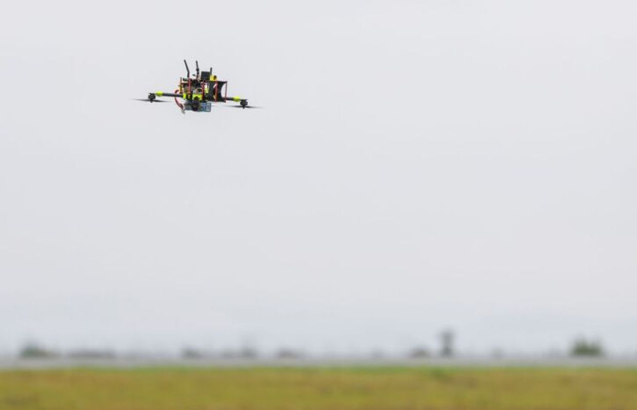 Eine "Jägerdrohne" zur Drohnenabwehr fliegt über einen Flughafen