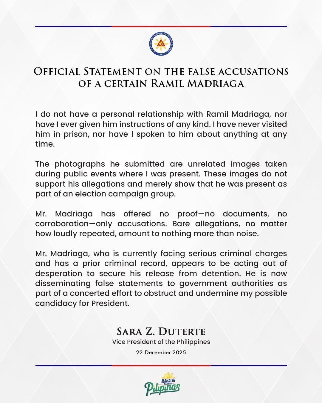 READ: Vice President Sara Duterte denies any personal relationship with Ramil Madriaga, who described himself as Duterte's alleged bagman. She says she has neither given him instructions nor visited him in prison.