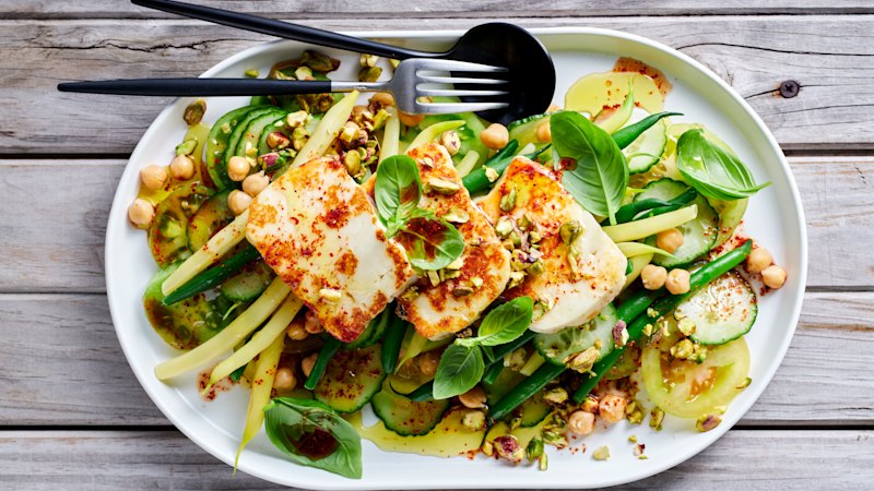 Green bean and chickpea salad with crispy halloumi and Tajin dressing