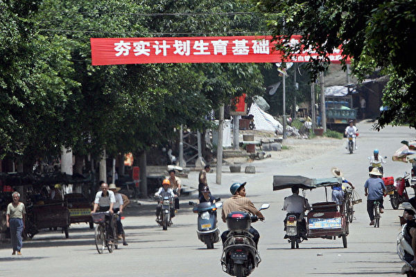 2007年5月24日,广西数千人走上街头,愤怒抗议当地政府强行执行所谓“独生子女政策”的做法。当地居民指控当局强迫妇女堕胎并破坏房屋,手段极其残暴。图为一条红底白字的计生标语挂在通往广西博白镇政府办公楼的道路上。(GOH CHAI HIN/AFP via Getty Images)