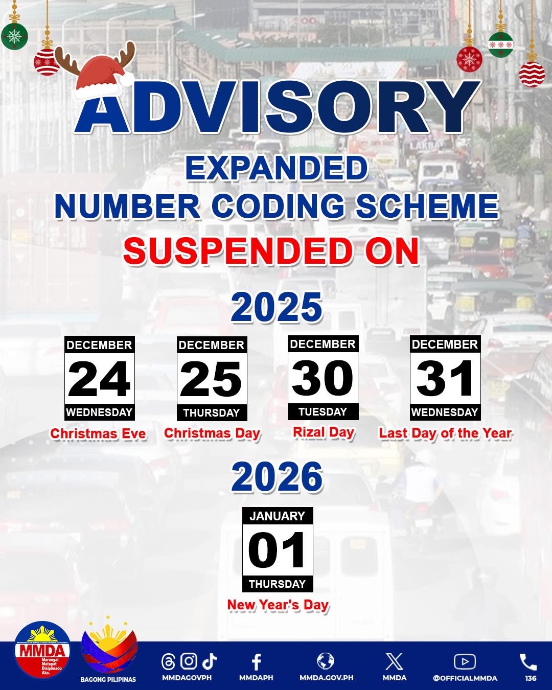 LOOK: The MMDA suspends the number coding on Dec. 24, 25, 30, 31, and Jan. 1, in light of the holidays. | @bylancemejico