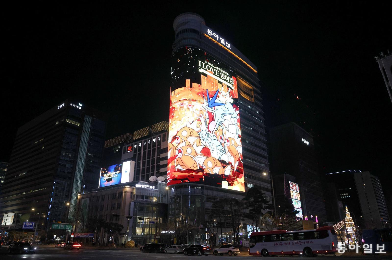 21일 서울 광화문 동아미디어센터 외벽에 설치된 국내 최대 미디어 사이니지 룩스(LUUX)에 포켓몬 ‘잉어킹’과 ‘갸라도스’가 송출되고 있다. 포켓몬코리아와 협업으로 청계천 70m 구간에 설치된 ‘l LOVE 잉어킹’ 프로젝트와 참여형 이벤트 ‘룩스와 함께 잉어킹 노래 맞추기’는 20일부터 1월 4일까지 진행된다. 룩스 화면에 등장하는 포켓몬을 촬영해 ‘#잉어킹룩스’ 해시태그를 달아 SNS에 올리면 추첨을 통해 경품을 받을 수 잇다.
