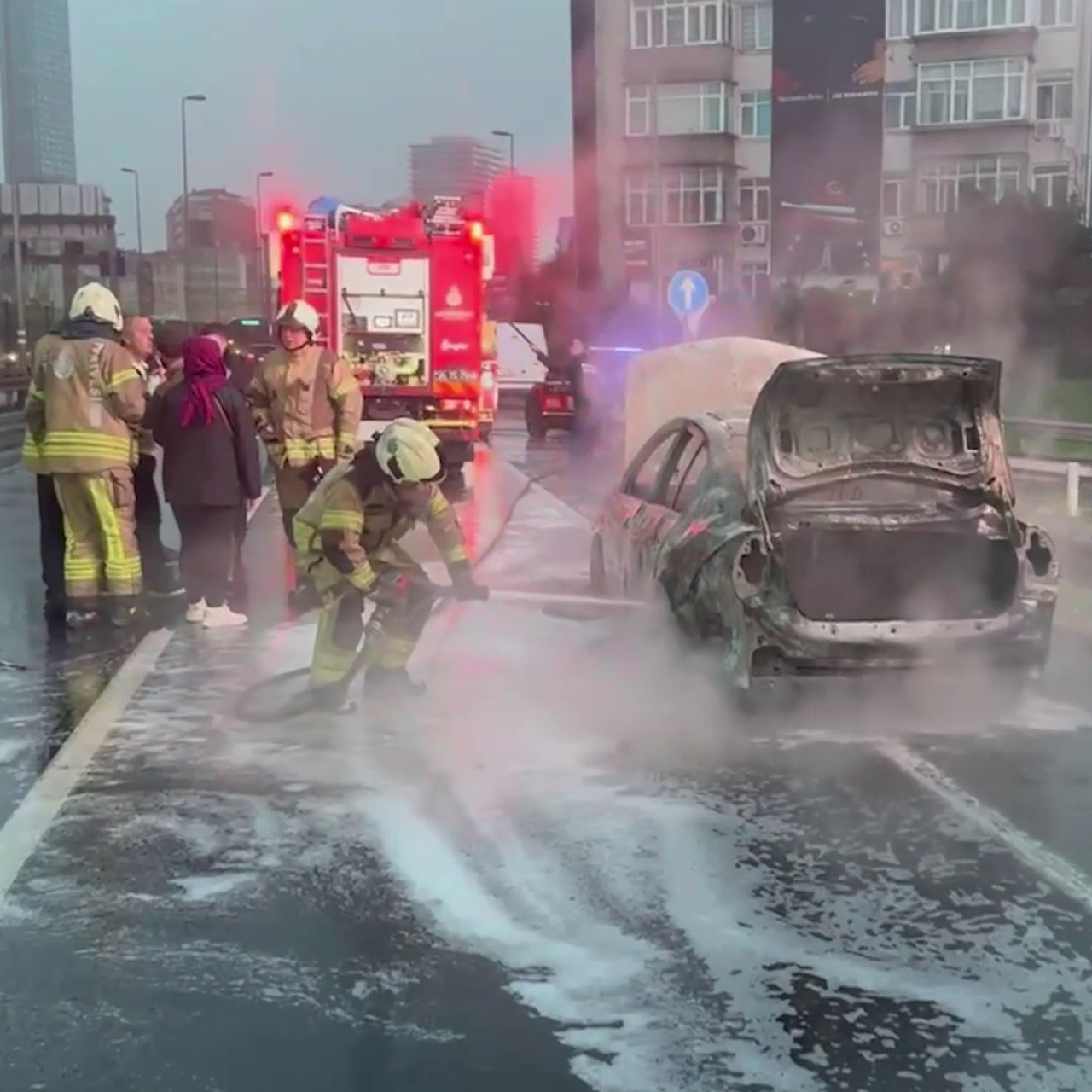 İstanbul Şişli'de D-100 kara yolu Ankara istikametinde seyir halindeki bir araçta yangın çıktı. Sürücü, aracından yükselen dumanları fark edince emniyet şeridinde durdu. Yağmur trafiği ile birlikte bölgede yoğunluğa neden olan olay nedeniyle uzun araç kuyrukları oluştu
