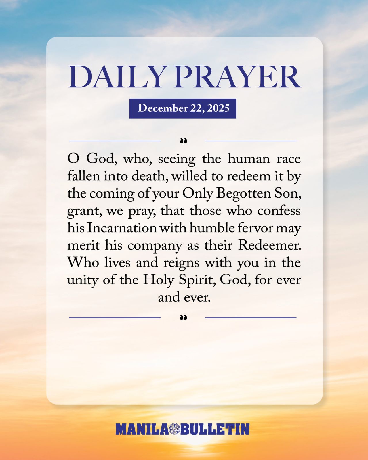 O God, who, seeing the human race fallen into death, willed to redeem it by the coming of your Only Begotten Son, grant, we pray, that those who confess his Incarnation with humble fervor may merit his company as their Redeemer.
