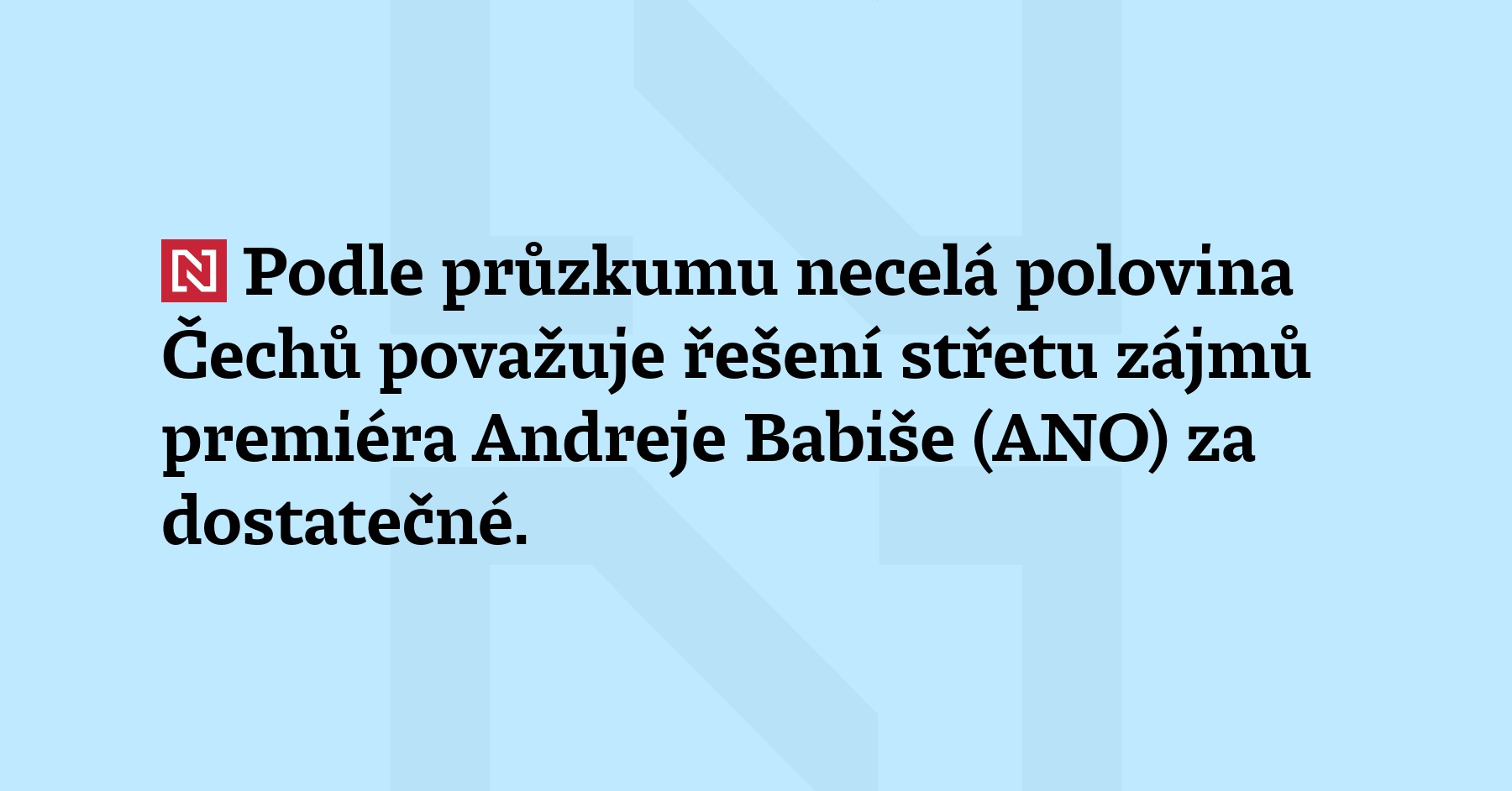 Podle průzkumu necelá polovina Čechů považuje řešení střetu zájmů premiéra Andreje Babiše (ANO) za dostatečné. Záměr předsedy vlády a majitele holdingu Agrofert vyhovuje 46 procentům respondentů, 39 procentům naopak představené řešení nestačí. Vyplývá to z bleskového průzkumu agentury NMS pro Český rozhlas, kterého se v půlce prosince zúčastnilo více než tisíc respondentů. (iRozhlas)