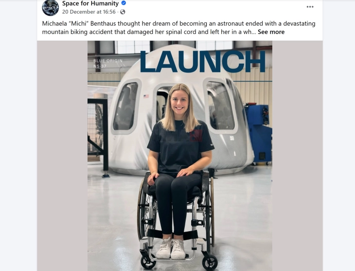 Инженерка од Германија стана првиот човек во ортопедска количка во светот кој отпатува во Вселената. Михаела - „Михи“ Бентаус, која претрпела повреда на 'рбетниот мозок во несреќа со планински велосипед пред седум години, потоа преку интернет контактирала пензиониран вселенски инженер, во обид да го следи нејзиниот сон и да стане астронаут. Тоа сè уште било можно. Таа во саботата беше патничка на 10-минутен лет со „Блу ориџин“ ( Blue Origin ), компанијата за вселенски туризам основана од Џеф Безос. Бентаус и петмина други полетаа од Тексас и стигнаа до тн. граница меѓу небото и Вселената, позната како Карманова линија. - Тоа беше „најкул“ искуство! Не само што ми се допадна погледот и микрогравитацијата, туку ми се допадна и лебдењето нагоре. Беше толку кул, секоја фаза од одењето нагоре, изјави сега популарната Михи по слетувањето. „Њу шепард“ (New Shepard) - повеќекратно употребливото суборбитално летало на „Блу ориџин“, полета од лансирната рампа на американската компанија во Тексас. Бентхаус, инаку, работи во Европската вселенска агенција. Таа смета дека во оваа нејзина борба по несреќата, „сфатила колку нашиот свет е сè уште непристапен“ за лицата со попреченост. Ханс Кенигсман, пензионираниот менаџер на „Спејс-Икс“ ( SpaceX ) кој ѝ помогна во организирањето на вселенското патување, појде со неа за да понуди помош за време на летот доколку е потребно. - Ханс првпат го запознав преку интернет. Само го прашав, знаете, толку долго работевте за „Спејс-Икс“, дали мислите дека луѓе како мене можат да бидат астронаути?, рече Бентхаус - Во основа, таа ме инспирираше да го направам ова. Нејзиниот поттик ме убеди и јас да го направам тоа и едноставно да доживеам нешто што го гледам однадвор долго време, додаде тој. „Блу ориџин“ ја обезбеди опремата за поддршка со којашто Бентаус можеше во ортопедска количка да влезе и излезе од капсулата. Компанијата веќе однесе десетици туристи во вселената. Во април, поп-ѕвездата Кејти Пери, свршеницата на Безос - Лорен Санчез, и водителката Гејл Кинг, беа меѓу шесте жени испратени во Вселената со ракета „Блу ориџин“ за лет што траеше околу 11 минути. Летовите се случуваат во време кога приватните вселенски компании се натпреваруваат за поголем дел од колачот наречен вселенски туризам.
