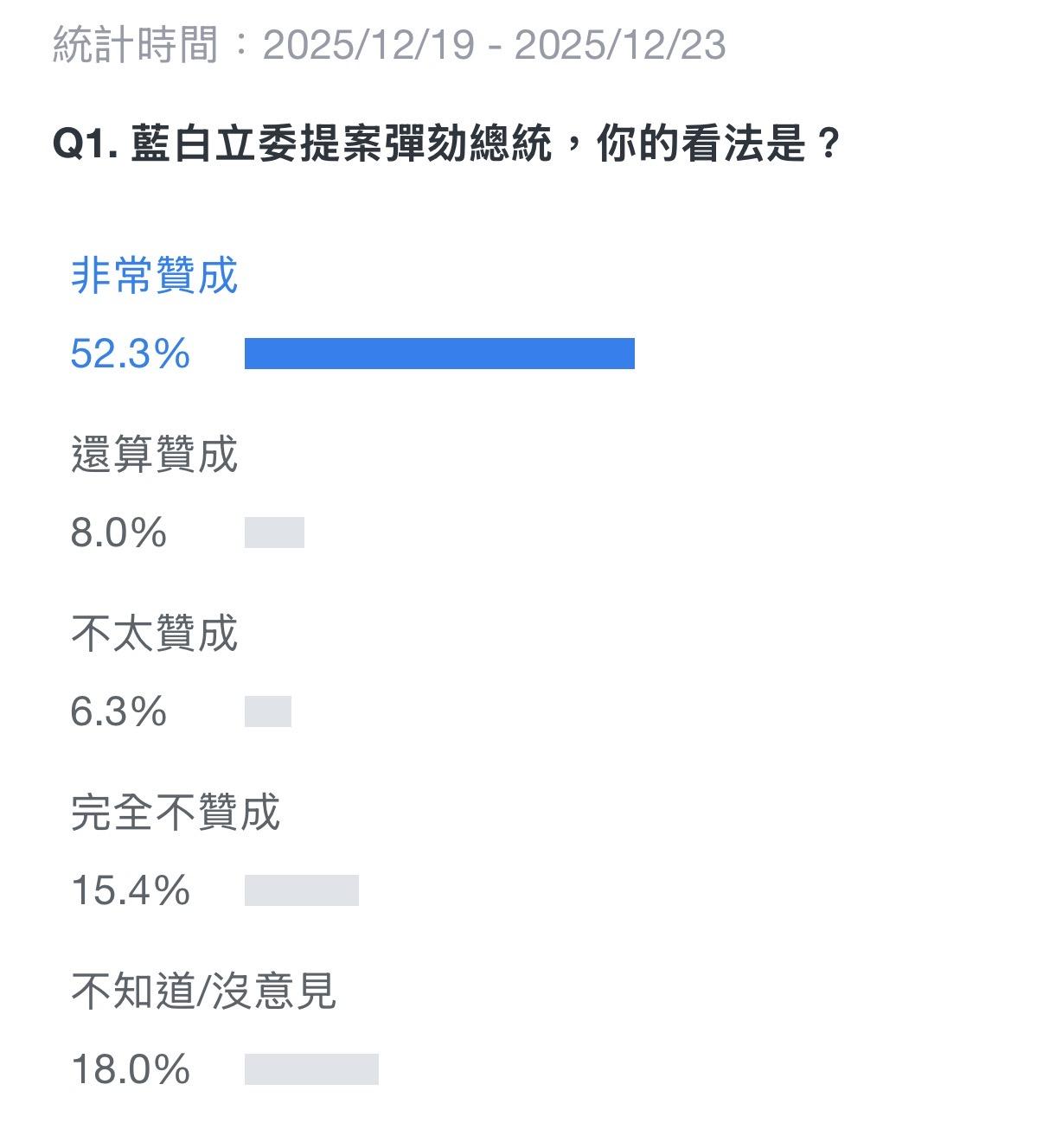 Newtalk新聞 行政院日前召開記者會表示,將對立法院此次送出的《財政收支劃分法》(簡稱財劃法)採取「不副署、不公布」,引起立法院藍白兩黨怒批「獨裁」,並表示將對總統賴清德提出彈劾案,引起各界關注。 對此,Yahoo 民調日前舉辦「藍白立委提案彈劾總統,你的看法是?」投票。投票自 19 日開始,截至今(22)日下午三時為止,共有 9.2 萬帳號參與投票,「非常贊成」人數佔 52.3%,「不知道/沒意見」比例為 18%,「完全不贊成」人數為 15.4%,「還算贊成」 8%,「不太贊成」6.3%。 Yahoo 民調「藍白立委提案彈劾總統,你的看法是?」截至今(22)日下午三時。 圖:翻攝自 Yahoo 民調 與先前即時數據相比,剛開始投票時, 19 日下午二時有逾 6 千帳號參與投票,「非常贊成」人數佔比 77.9%;昨(21)晚九時有 3 萬帳號參與投票,「非常贊成」人數佔 78%。 該投票至明(23)日截止,數字仍在滾動顯示,而該投票以 Yahoo 帳號登入投票作為登記,僅能做風向調查,並無研究依據。 延伸閱讀: 伊朗一百多戰機 沒一架敢升空迎敵! 完全測不到以F-35 防空系統太老舊也停擺 日本將重啟全球最大核電廠! 距東京僅220公里 近70%居民感到憂慮 艾普斯坦檔案川普與小女孩照片急撤! 連拿掉16份文件 司法部:保護受害者 馬克宏「陣前背叛」梅爾茨? 歐盟凍俄財資產卡關 英日另行再加碼援烏 時隔近4年 普丁與馬克宏將再會談! 法國「恰巧」在這件事上做出重大轉變 星鏈衛星爆炸! 近地軌道形成碎片帶 另一星鏈曾與中衛星驚險「擦肩而過」