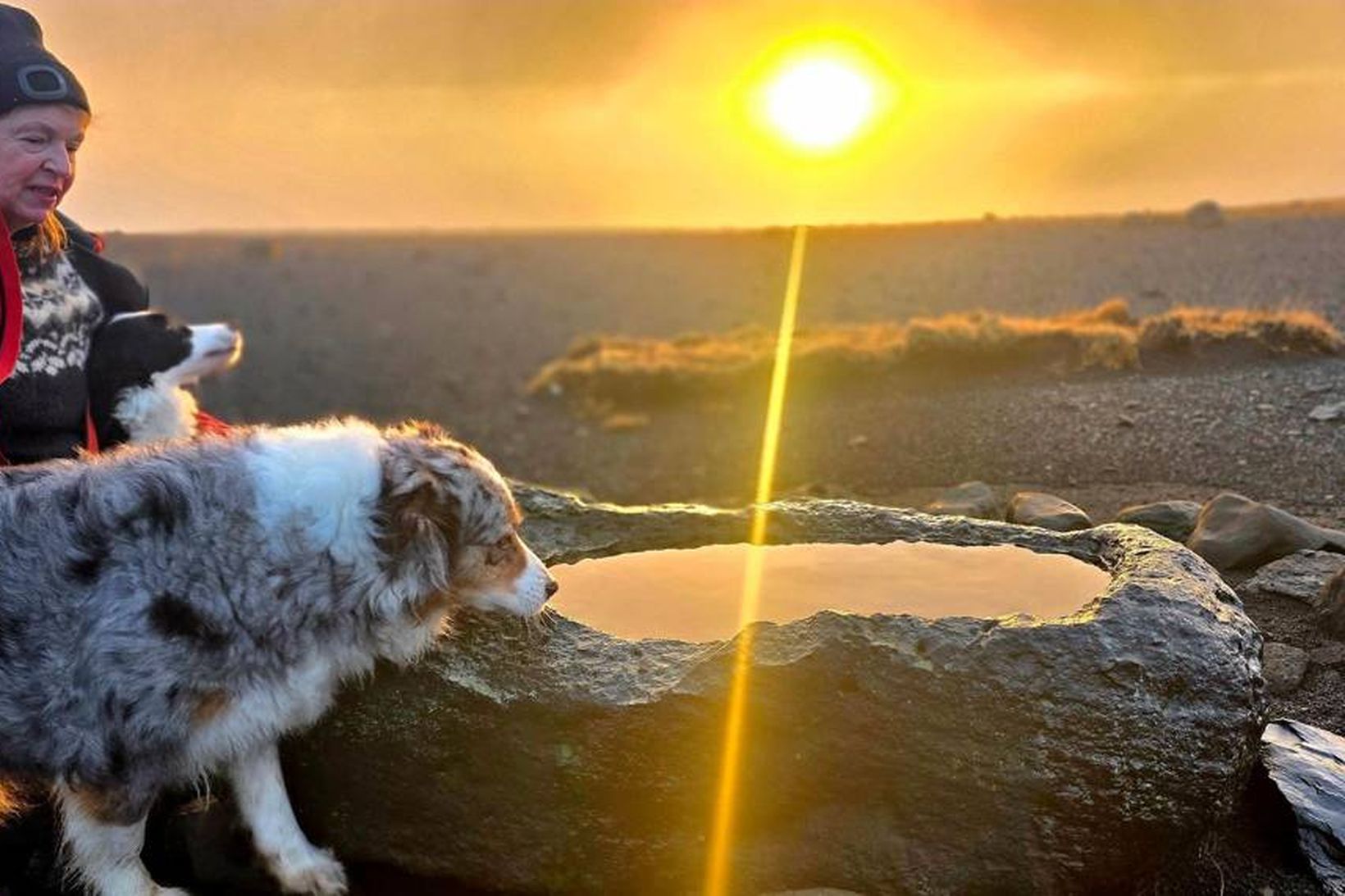 Þær Ragnhildur Jónsdóttir, Yrja og Píla stöldruðu ögn ásamt Jónasi Erlendssyni í Fagradal við tilhöggna steinskipið á Fagradalsheiði í Mýrdal um þrjúleytið í gær, eða rétt um það leyti sem vetrarsólstöður voru