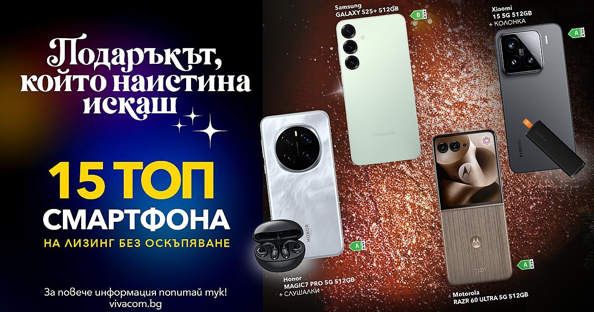 Коледа идва с магия, светлини и възможност за най-хубавите поводи да зарадваме любимите си хора с подаръка, който наистина искат. Vivacom предлага серия от празнични предложения за своите клиенти, за да допринесе за една истински вълшебна Коледа с Vivacom. Телекомът предлага специална селекция от избрани смартфони на лизинг без оскъпяване в сравнение с цената при еднократно плащане при скл. на 24-м. договор за Unlimited 200/MAX и с включени подаръци към някои от тях. Офертите са валидни от 10 декември 2025 г. до 8 януари 2026 г. при сключване на договор с план от семейството Unlimited.Клиентите могат да се възползват от офертата както в търговската мрежа на Vivacom, така и онлайн на vivacom.bg. А до 04.01.26 всички нови и текущи абонати на Vivacom с мобилни услуги на тарифни планове Unlimited и Unlimited Traffic ще могат да сърфират на максимална скорост в 5G мрежата на Vivacom*. Телекомът премахва ограниченията на скоростите на плановете и дава пълна свобода на своите абонати да се в...