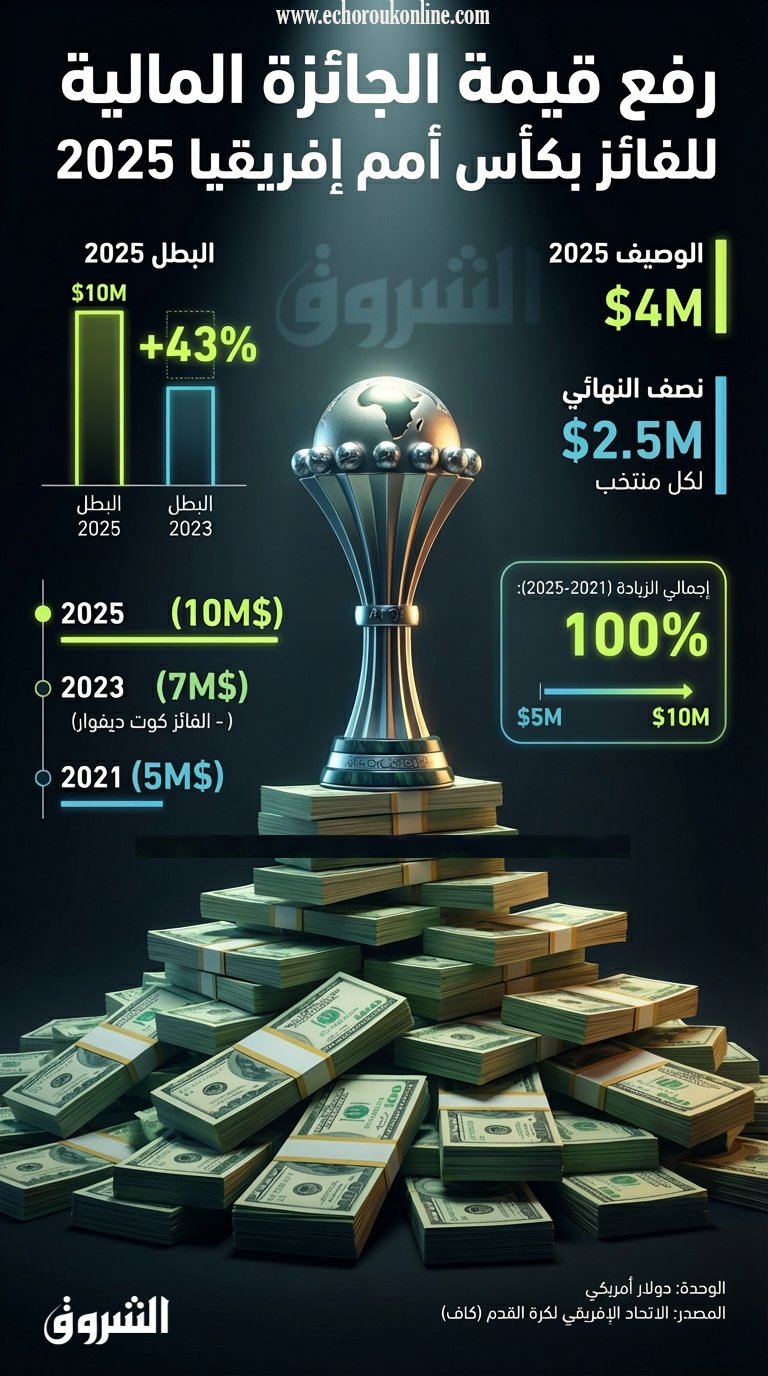 أعلن رئيس الاتحاد الإفريقي لكرة القدم، باتريس #موتسيبي، أن الفائز بلقب #كأس_أمم_إفريقيا المغرب 2025، سيحصل على جائزة مالية قدرها 10 ملايين دولار أمريكي.