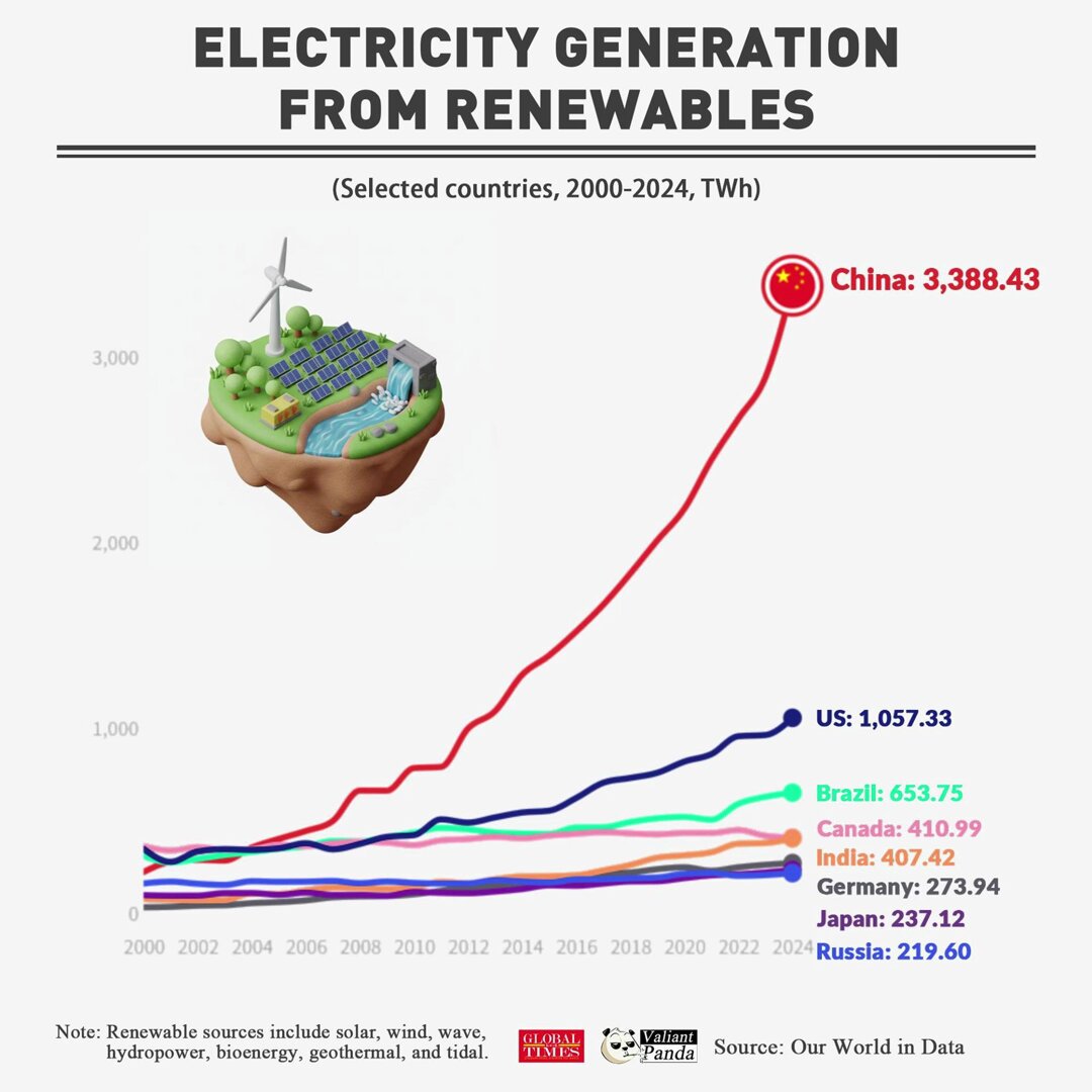 #China’s renewable power generation reached 3,388 TWh, which was more than the US, Brazil, Canada and India combined.