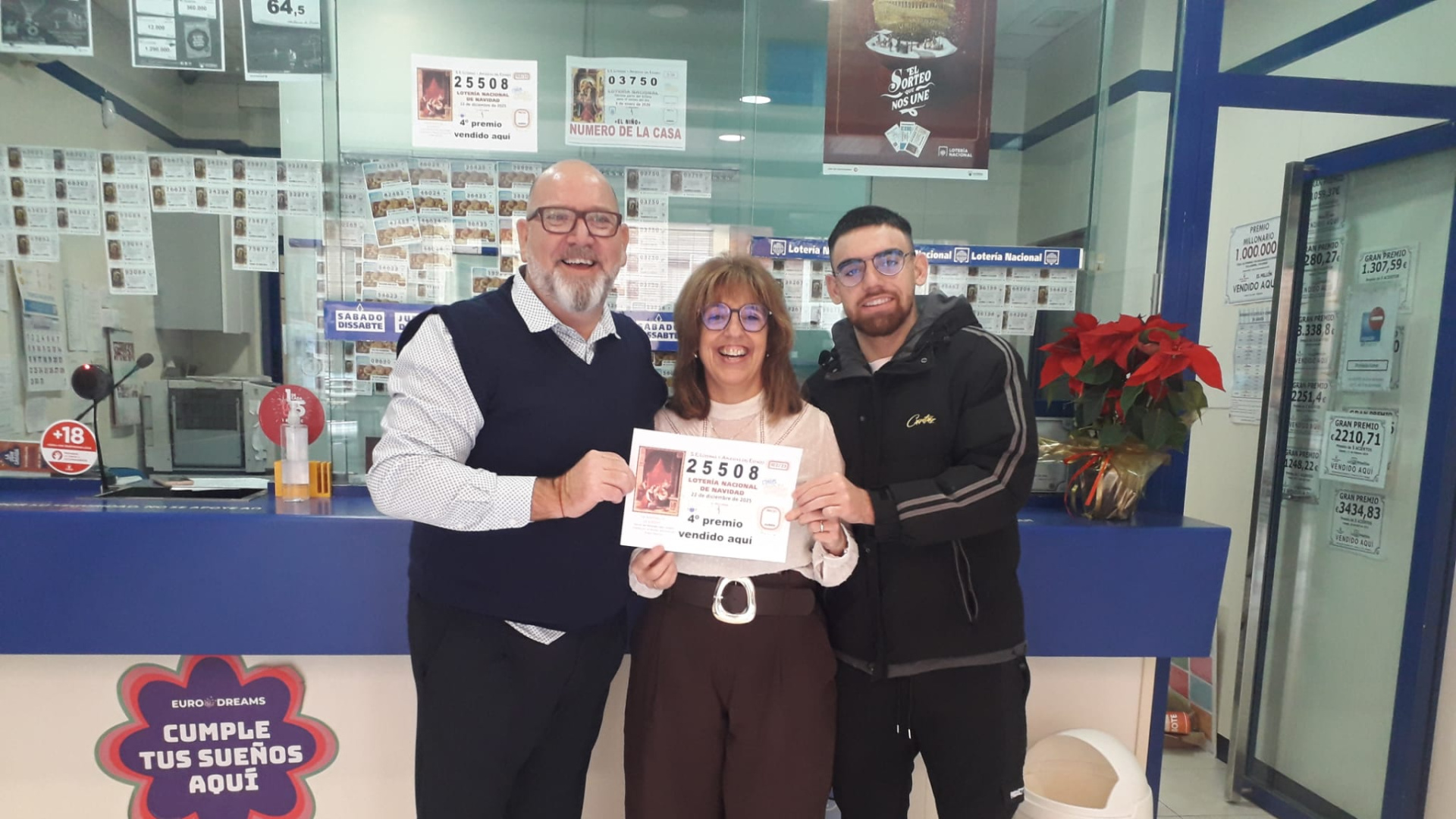 La localidad de Pedreguer ha vuelto a ser agraciada en el Sorteo Extraordinario de la Lotería de Navidad. La administración de loterías ha repartido parte de uno de los cuartos premios, correspondiente al número 25.508 . Según ha explicado la responsable, Bea, se ha vendido una serie completa y varios décimos más por ventanilla, llevando la alegría a numerosos vecinos y abonados al número. Este no es el primer gran premio que reparte esta administración de Pedreguer. Tal y como recuerda su responsable, este es el segundo cuarto premio que entregan en su historia. Su fortuna se completa con un quinto premio y, especialmente, con un segundo premio del sorteo de Navidad que ya repartieron en el año 2018. "Hemos dado un quinto, dos cuartos y un segundo", ha resumido Bea sobre su trayectoria. A pesar de la magnitud del premio, la lotera ha comentado que en la administración viven la celebración con tranquilidad, ya que de momento no se ha acercado ningún premiado. "De momento, estoy supertranquila, porque no ha venido ningún ganador", ha explicado. Sin embargo, la alegría es inmensa entre el personal: "Estamos supercontentos, la verdad que sí", ha confesado Bea, mientras esperan con ilusión la llegada de los primeros afortunados.