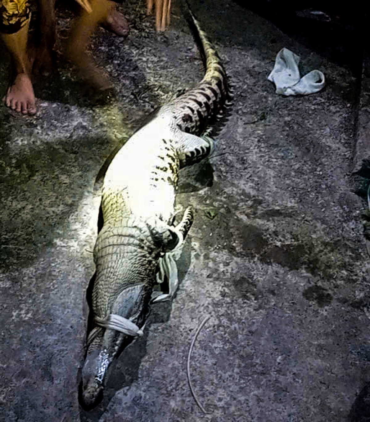 Cá sấu dài hơn 1m, nặng hơn 10kg bất ngờ xuất hiện tại ao nước gần nhà dân ở phường Tân Thành (tỉnh Cà Mau), khiến người dân lo lắng và phải vây bắt trong đêm.