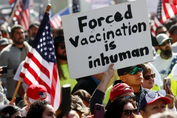 2021年11月8日,加州洛杉矶市政厅外的格兰德公园(Grand Park),抗议者聚集在一起,参加“自由游行”集会,反对洛杉矶市议会强制要求市政雇员和承包商接种新冠疫苗的规定。(Mario Tama/Getty Images)