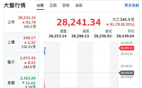 Newtalk新聞 台股今天(23日)開紅漲逾91點,最高來到28298點,上櫃、電子揚升。金融類股下挫。聚焦重要電子權值股,約9點20分前,台積電漲15元、來到1480元。鴻海漲1元、來到225元。台達電漲9元、來到962元。廣達跌1元、來到266元。聯發科漲5元、來到1405元。 分析師葉俊敏表示,台股昨天 453( 1.64%)、收28149點,成交量4930億。KD值低檔黃金交叉向上,OTC 4.2( 0.1.60%)、收266.8點,成交量1291億。領漲前30大權值、漲幅3%,包括信驊、群聯、台燿、穩懋、新應材、威剛、聯亞、富喬、順達。 分析師盤點台股重要資訊如下: 華星光法說會,AI資料中心需求,帶動800G高速光模組、矽光及長距離ZR應用高速成長。達明機器人宣布與台船合作,達明將2026年量產輕量化TM3 AI協作機器人,運用於造船產業。 金像電代泰國子公司公告取得廠務工程,交易金額約新台幣10.6億元,2026年資本支出由今年約50億〜60億元,升至60億〜70億元。金山電法說,明年上半年AI需求(PCB、電源、BBU)保持強勁,帶動電容出貨,其餘市場則較為持平。 星宇航空法說會,隨著交機高峰到來,預計明年會開2個歐洲新航點,並持續評估北美和大洋洲。 ※Newtalk提醒您: #投資一定有風險,投資有賺有賠,投資前應檢視自身能力,申購前應詳閱公開說明書。 延伸閱讀: 台積電2奈米滿訂、鴻海AI營收破兆!法人評析買進時間一次看 主動式ETF新兵上陣!00990A掛牌半小時成交逾6萬張、上漲逾2% 先進製程加持!2026年半導體續熱 台積仍受惠優勢曝光 AI商機全包!00881鎖定九成供應鏈 專家評析一次看 市場喜迎「聖誕老人行情」美股四大指數全收漲 台積電ADR漲1.5%