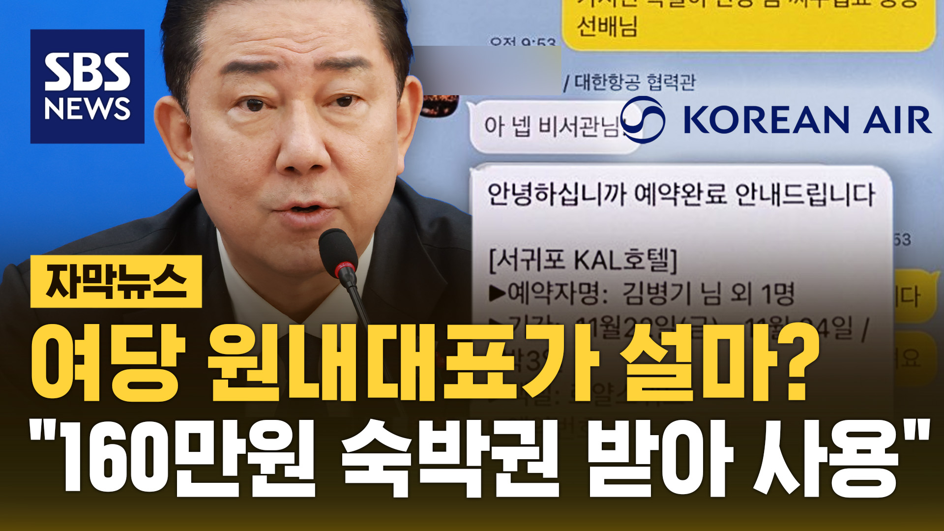 김병기 민주당 원내대표가 대한항공에서 받은 호텔 숙박 초대권으로 160만원 상당의 고급 객실을 이용한 정황이 나왔습니다.SBS가 확보한 메신저 …