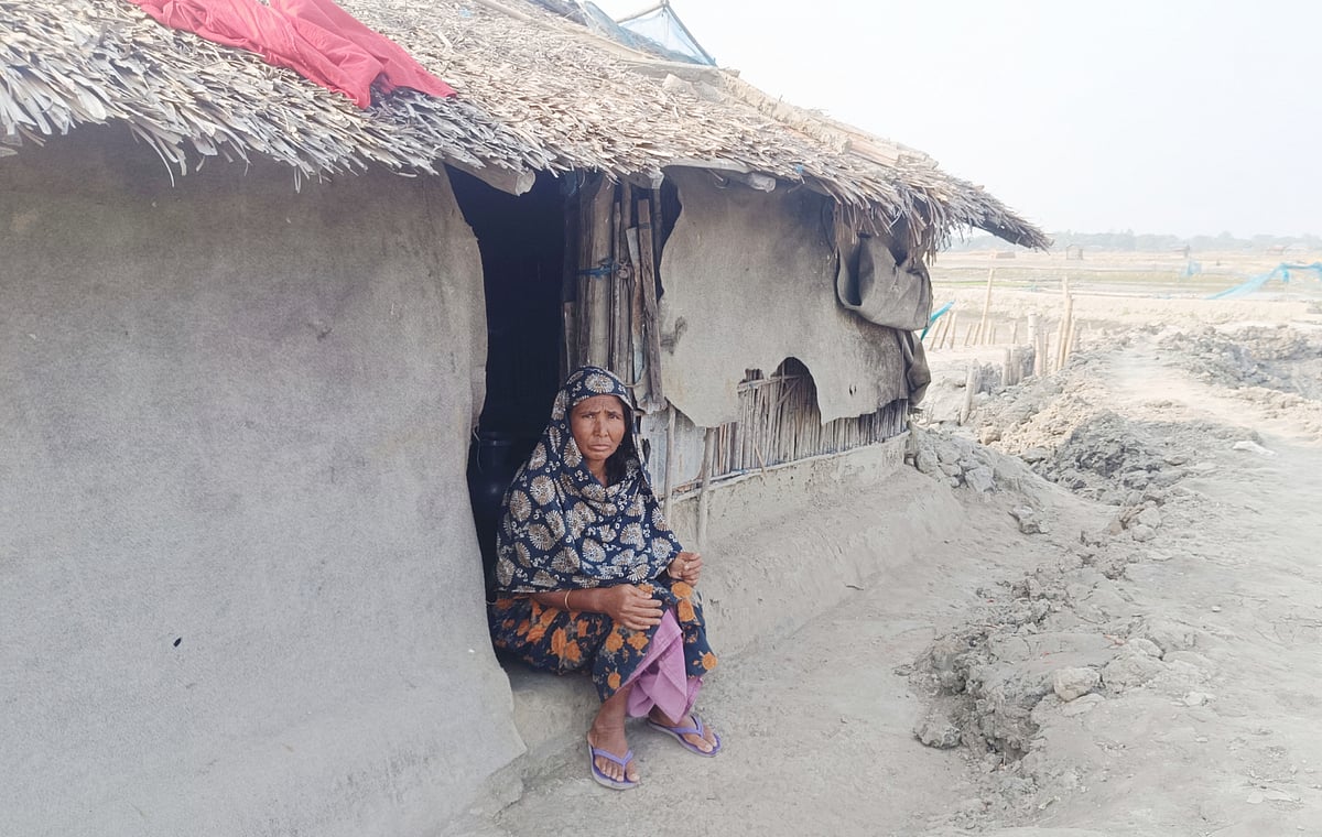খুলনার কয়রা উপজেলার সুন্দরবনের প্রান্তে নদী-বেড়িবাঁধের ঢালে ঘরহারা এক বৃদ্ধার বেঁচে থাকার লড়াই করছেন।