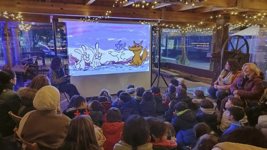 Elena Bangueses en la voz y Luis Davila a los lápices ofrecieron ayer un cuentacuentos animado al público infantil que se acercó ayer al astillero de Purro para disfrutar de una de las actividades para el público más joven de la programación navideña en Bueu.