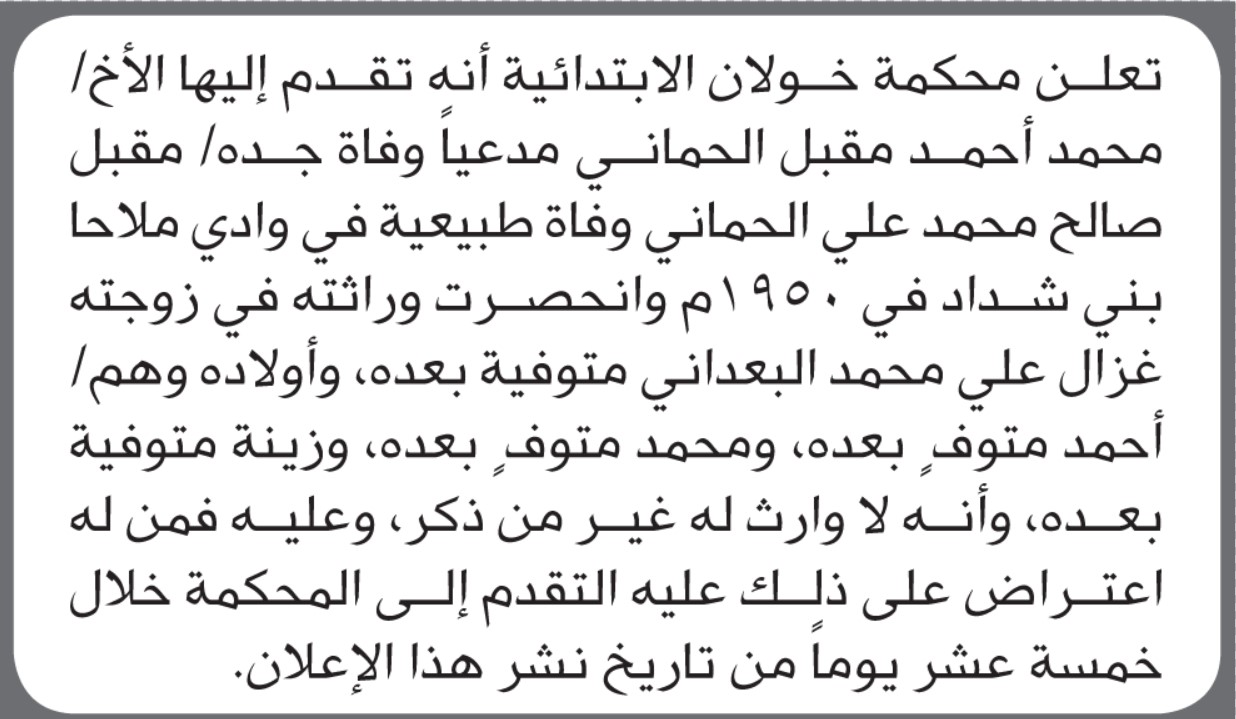 تعلن محكمة خولان أن الأخ محمد أحمد الحماني تقدم بدعوى انحصار وراثة