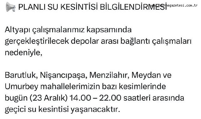 Planlı Su Kesintisi Yaşanacak
