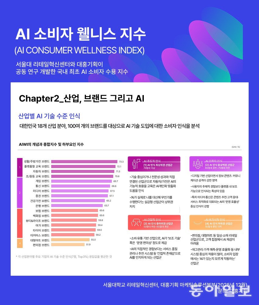 대홍기획은 서울대학교 생활과학대학 부설 리테일혁신센터와 협업해 ‘AI 소비자 웰니스 지수(AI Consumer Wellness Index, AIWI)’를 공동 개발했다고 23일 밝혔다. 국내 최초로 AI 기술에 대한 소비자의 수용도와 삶의 만족도를 통합 특정한 리포트다. AI 소비자 웰니스 지수 진단 결과, 18개 산업군 및 100여 개 브랜드를 대상으로 한 소비자 AI 기술 인식 조사 결과를 담았다.AI 소비자 웰니스 지수는 한국 사회의 AI 수용 수준을 객관적으로 측정하기 위해 개발됐다. 대홍기획은 소비자의 AI 사용 의도 및 목적, AI 활용이 삶의 질적 요소에 미치는 영향을 객관적 지표로 분석했다.‘챕터1(한국 사람들과 AI)’은 국내 소비자가 이용하는 AI 기술 유형과 AI 리터러시 역량, AI 소비자 웰니스 지수를 종합적으로 분석했다. 긍정 정서, 부정 정서, 자기실현, 윤리적 인식 등 네 가지 요인을 통합 측정한 한국인의 AI 소비자 웰니스 지수는 100점 만점에 62.